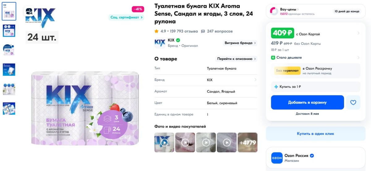 На OZON Туалетная бумага KIX Aroma Sense, Сандал и ягоды, 3 слоя, 24 рулона за 409 рублей с OZON картой (за 419 рублей без карты). Длина рулона 18 метров, 3 слоя, мягкая. Средняя оценка 4,9 звёзд на почти 160000 отзывов. Продавец сам OZON. Ссылка на наш канал
