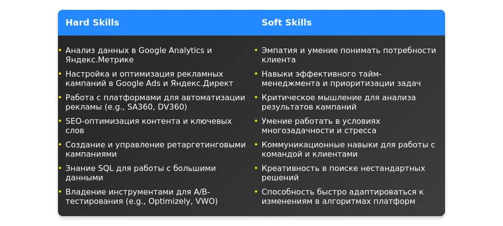 - Ключевые навыки (аналитика, настройка рекламных кампаний, работа с инструментами).