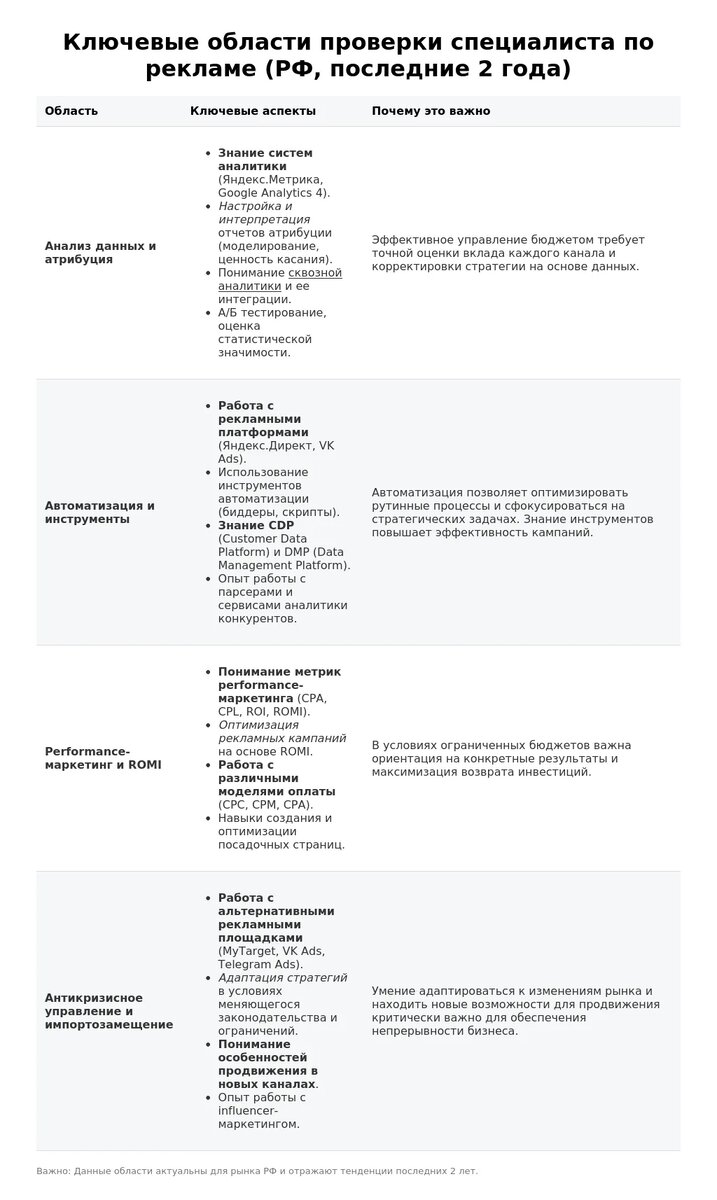 - Senior: "Я разрабатываю систему KPI для каждой кампании, учитывая бизнес-цели клиента. Я использую инструменты сквозной аналитики, чтобы отслеживать влияние рекламы на продажи и прибыль. Я также провожу регулярные аудиты и предлагаю стратегические рекомендации по улучшению рекламной деятельности."