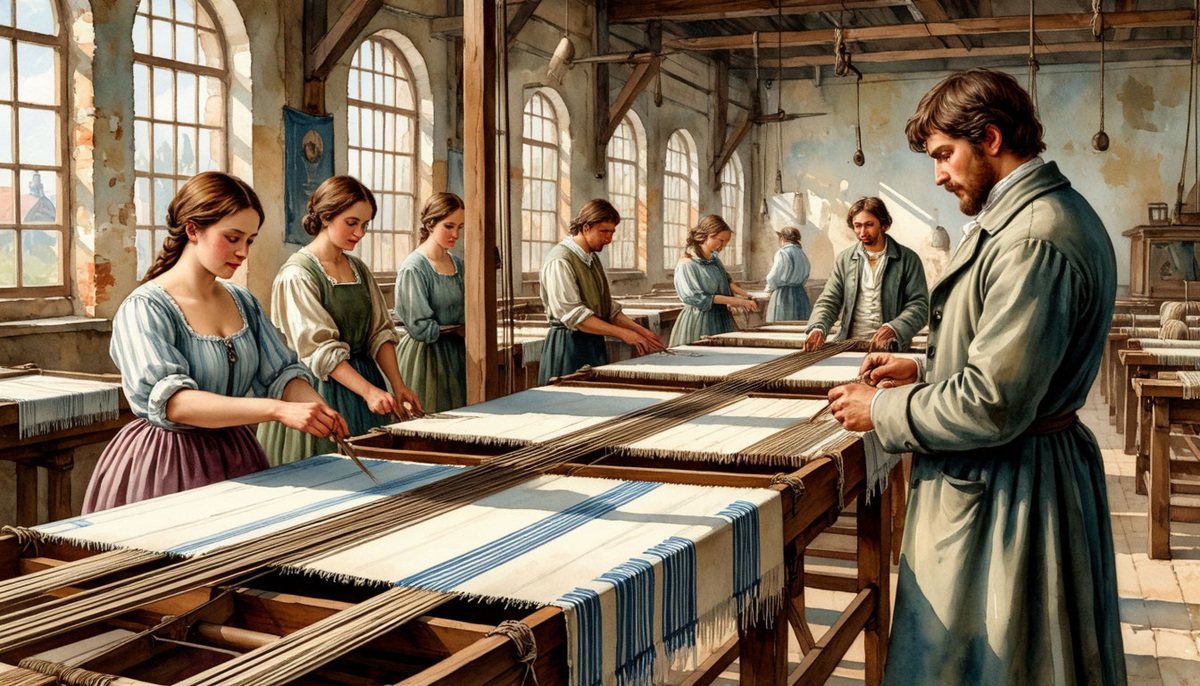 В начале XVIII века в Ярославле процветала текстильная мануфактура купцов Затрапезновых — знатной семьи, входившей в гильдию «гостиной сотни», которая контролировала торговлю и ремёсла. Их фабрика производила всё: от роскошных скатертей из фламского полотна (плотного хлопка с характерным блеском) до простой саржи и «волнушки» — грубого льняного полотна с рифлёной текстурой. Но главным хитом стали дешёвые ткани с синими полосами, которые быстро стали символом доступности. Их покупали крестьяне, ремесленники, мелкие чиновники — те, кто не мог позволить себе парчу или бархат.