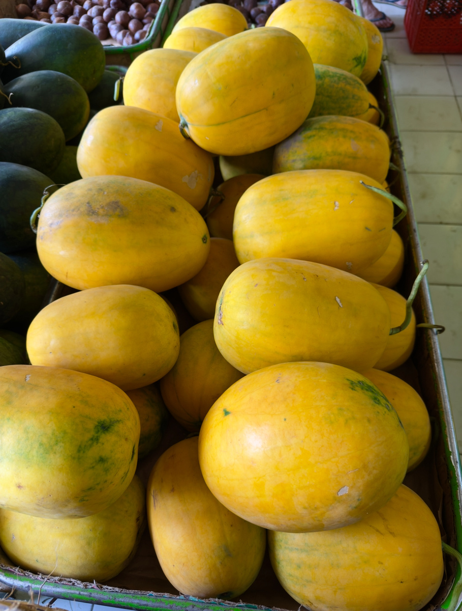 Пробовать новые фрукты — это целое культурное и сенсорное приключение. Открытие непонятного плода происходит параллельно с сравнением его вкуса со вкусом других более знакомых фруктов. Как правило, текстуры этих "заморских" фруктов, также удивляют не меньше вкуса — от хрустящего салакa до слизистой маракуйи. Один из таких "незнакомцев", который попался нам только на Бали - желтый арбуз, можно даже сравнить его цвет с золотым. Попался он нам только один раз на рынке и больше пока нигде его в продаже нет). Попробовать жёлтый арбуз — это как открыть альтернативную версию знакомого фрукта. Вроде бы — тот же арбуз, но совсем другой. Из-за меньшей популярности и непривычного цвета желтый арбуз считается экзотикой, но, оказывается, именно этот сорт - один из самых древних сортов бахчевых, известных человечеству, появившийся задолго до красных. Первые дикие арбузы, найденные в Африке, имели именно жёлтую или бледную мякоть. Красные сорта — это результат более поздней селекции. В отличие от к