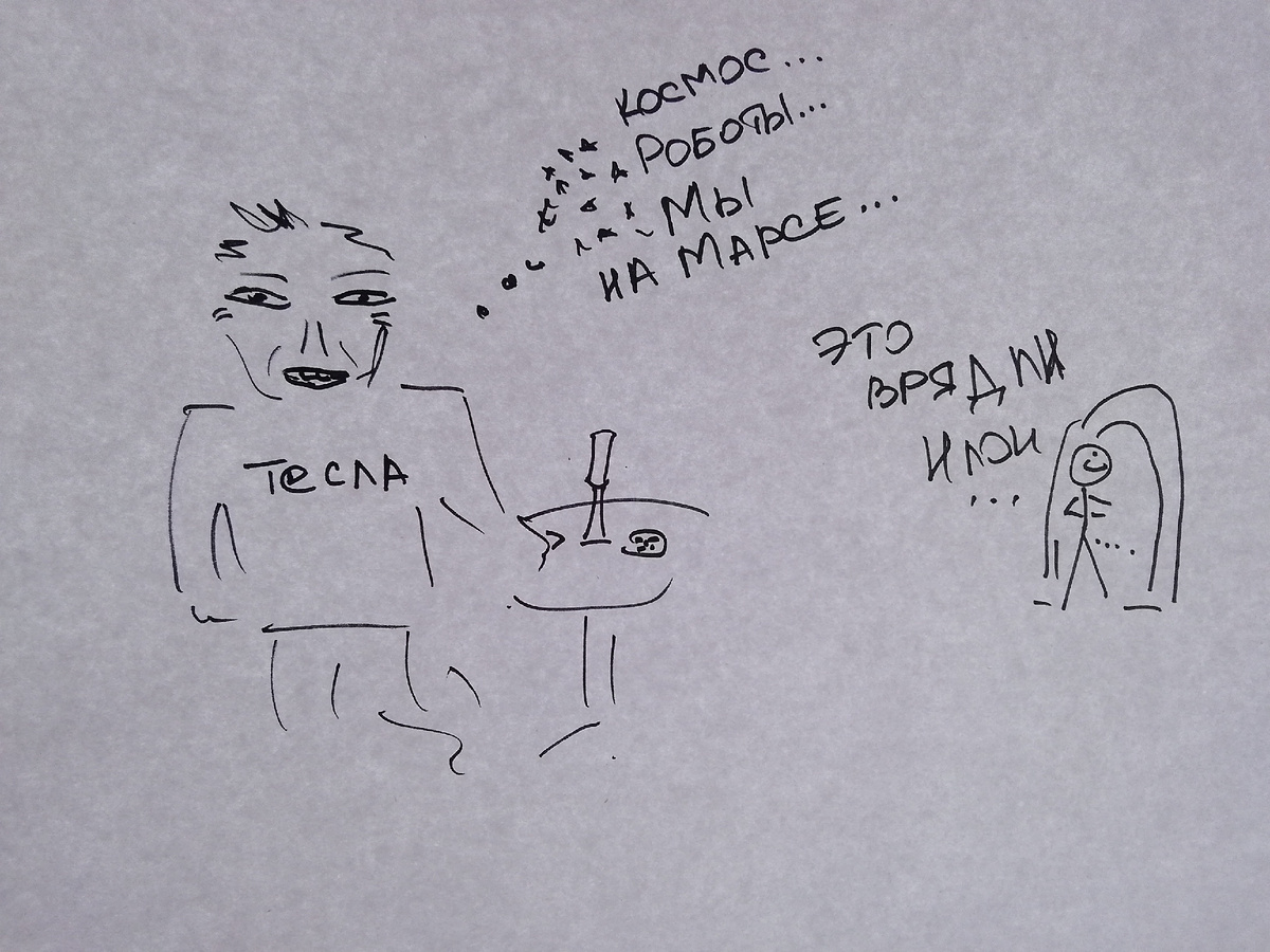 Я абсолютно уверена, люди с богатой фантазией и неуемной энергией меняют мир. Иногда даже к лучшему. Вот такие, как Илон Маск с его мечтами. Заслушаться можно. Только представьте этот новый, чудесный мир... Транспорт без водителей. Маск обещает, что его Tesla уже через несколько месяцев освободит своего владельца от необходимости следить за дорогой и помнить правила дорожного движения. Нервно чешет затылок собиратель штрафов. Выкуси! Машина не нарушит, пешехода не обидит и казну не пополнит. Я поняла, кто жжёт теслы... Но настоящий водитель не придёт в восторг от всей этой имитации. А как же поддать газку? А проскочить на поздний жёлтый? А высказать матом, что ты думаешь об этом... на самокате? Как же вся эта романтика? Нет. Лично я против. А вот пьяных уро... членов партии КПРФ и ему подобных, после сурового наказания, не пускать в настоящую машину. Разве что со связанными руками - ногами и только в богаж... на пассажирское. Дмитрий Дубовенко, член партии КПРФ устроил ДТП, в к