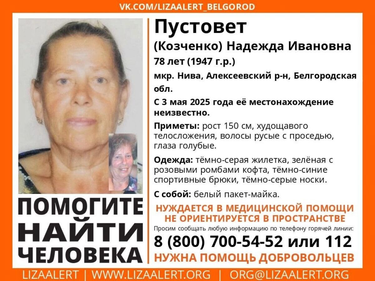 В белгородском микрорайоне Нива Алексеевского района пропала 78-летняя Надежда Пустовет. О местонахождении пенсионерки ничего неизвестно с субботы, 3 мая. Волонтеры предполагают, что Надежда может находиться в Воронежской области. Ориентировку распространили в поисковом отряде "Лиза Алерт". Рост Надежды составляет 150 сантиметров. У женщины русые волосы с проседью, голубые глаза и худощавое телосложение. Когда пенсионерка выходила из дома, она была одета в темно-серый жилет, зеленую кофту с розовыми ромбами, темно-синие брюки и темно-серые носки. С собой Надежда взяла белый пакет-майку. Женщина не ориентируется в пространстве и нуждается в медицинской помощи. Если вы обладаете информацией о предположительном местонахождении Надежды Пустовет, просьба сообщить об этом в службу 112 или позвонить волонтерам по номерам, указанным на ориентировке. Ранее волонтеры поискового отряда рассказали о поисках пропавших на минувшей неделе. Им удалось найти 16 человек, среди которых оказалось 10 детей