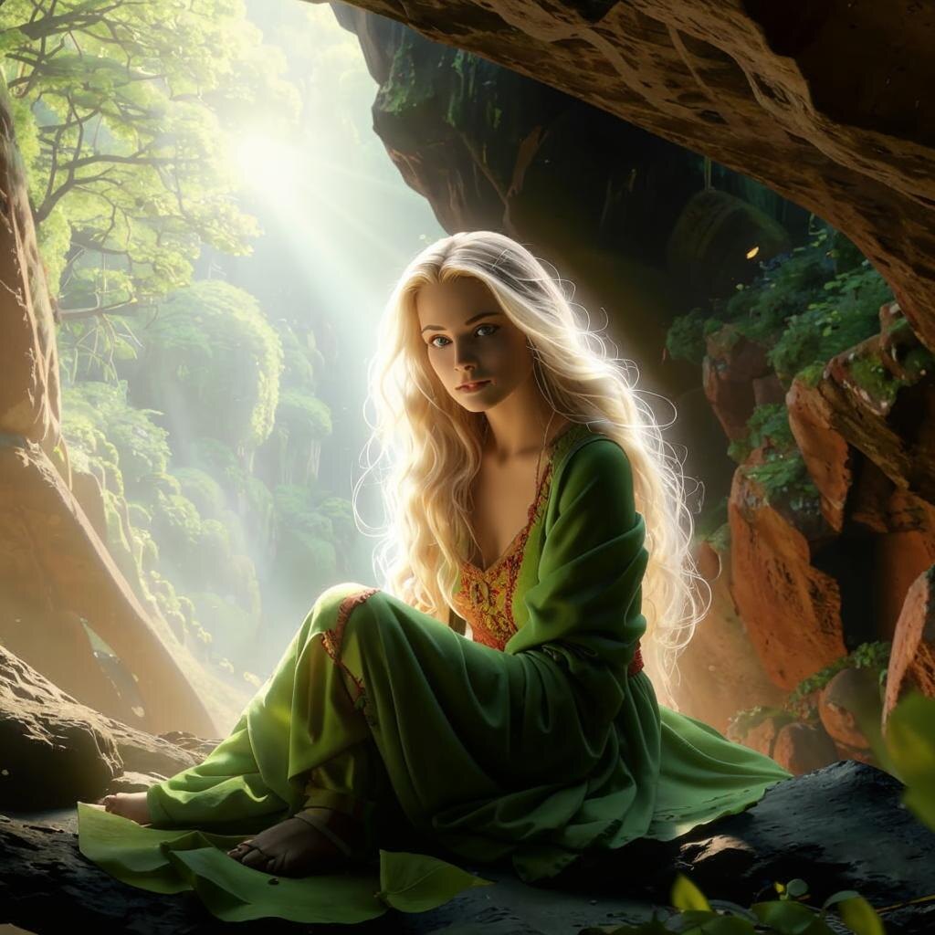 Ее глаза были невероятного, изумрудного цвета, словно отражали свет, исходящий из глубины пещеры. Бледная кожа, тонкие черты лица, и легкая, печальная улыбка. Она была прекрасна, как видение из другого мира.