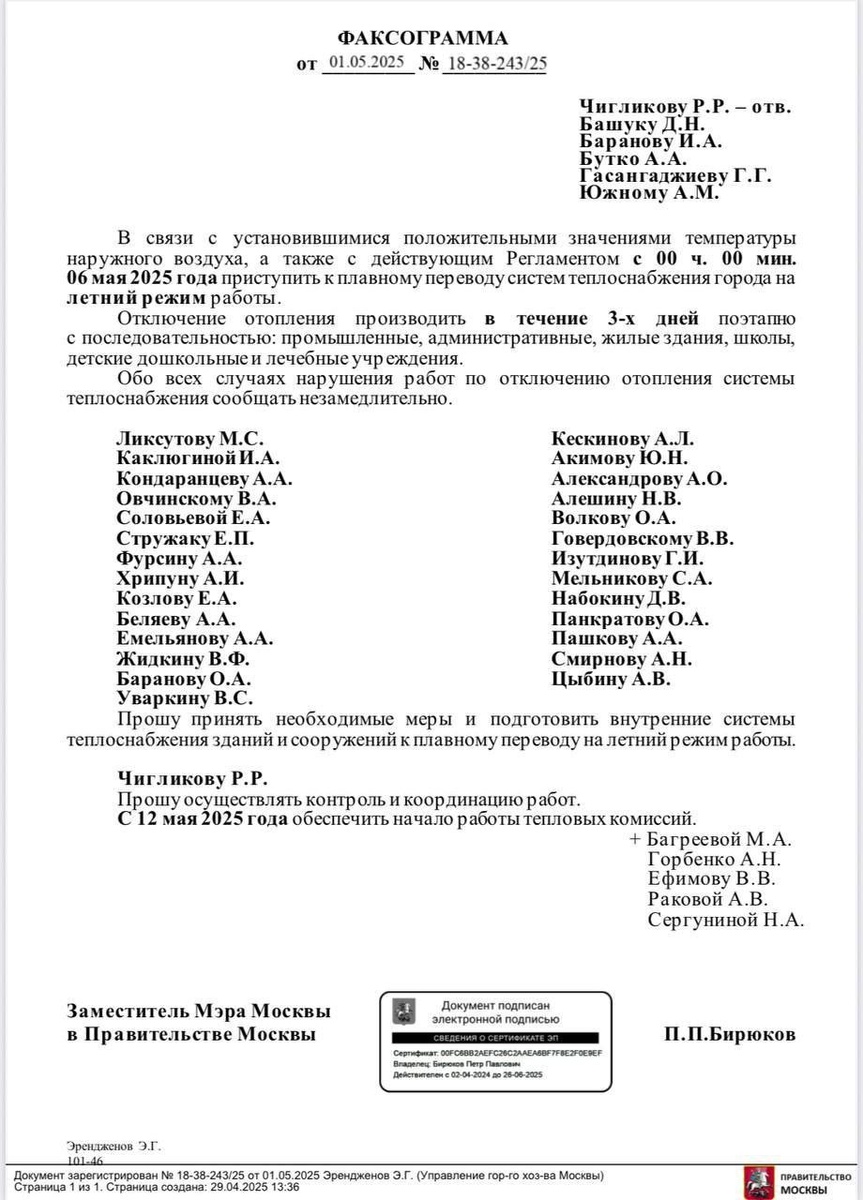🧹🚰‼️❗❕1 мая 2025г. зам. мера г. Москвы П. П. Бирюков подписал факсограмму, в которой приказывает «с 00 ч. 00 мин. 06 мая 2025 года приступить к плавному переводу систем теплоснабжения города на летний режим работы». Так же в общий доступ выложен график отключения горячей воды, который можно узнать на: 1) сайте mos.ru в своем личном кабинете; 2) в личном кабинете на сайте ПАО «МОЭК»https://online.moek.ru/; 4) на сайте https://tatspravka.ru/gorvoda/ (выберете свой Округ, район, улицу, дом); 5) по телефону единой справочной службы Правительства Москвы +7 (495) 777-77-77; 6) по телефону единой диспетчерской службы +7 (495) 539-53-53. Справочно сообщаем, что горячую воду могут отключать не более чем на: 8 часов (суммарно) в течение одного месяца; 4 часа подряд; 24 часа при аварии на магистрали; 10 суток раз в год при проведении профилактических работ. ❗️🔵🔵🔵🔵❗️ ЖКХ в Восточном Дегунино касается каждого ❗️ Важная информация для жителей 📣: ‼️ Приглашайте в группу и канал своих друзей