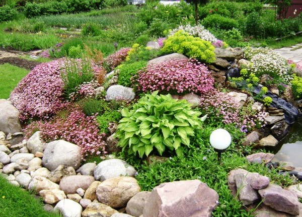 Нижние части и подножие — влаголюбивые растения (примулы, хосты, мшанка).