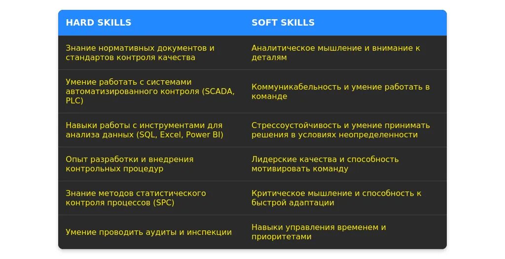 Анализ: Обязательные требования — опыт работы в сфере контроля качества и знание законодательства. Желательное — умение работать с большими объемами данных.