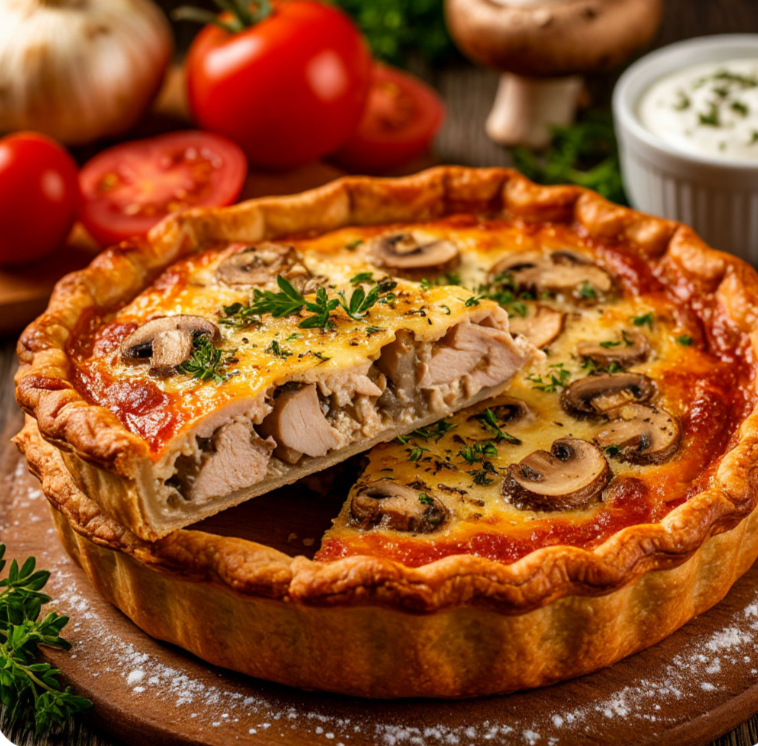 Приготовим сегодня изысканный лоранский пирог с курицей и грибами, который порадует своим нежным вкусом и ароматом! Начнем с теста: 150 г сливочного масла (охлажденного) нарезаем кубиками и выкладываем в миску с 2 стаканами пшеничной муки. Добавляем щепотку соли. Перетираем масло с мукой в крошку. Добавляем 1 куриное яйцо и замешиваем тесто. Формируем из теста шар, заворачиваем в пищевую пленку и убираем в холодильник на 30 минут. Пока тесто охлаждается, приготовим начинку: 400 г куриного филе нарезаем небольшими кубиками. 200 г шампиньонов нарезаем пластинками. 1 репчатый лук мелко шинкуем. В сковороде разогреваем 50 мл растительного масла. Обжариваем лук до золотистого цвета. Добавляем куриное филе и обжариваем до готовности, около 10 минут. Добавляем грибы и обжариваем еще 5-7 минут. Солим и перчим по вкусу. Теперь приготовим заливку: 100 г помидоров нарезаем кубиками. 2 шампиньона нарезаем пластинками. В миске смешиваем 1 стакан сметаны, 4 куриных яйца, соль и перец по вкусу. Добав