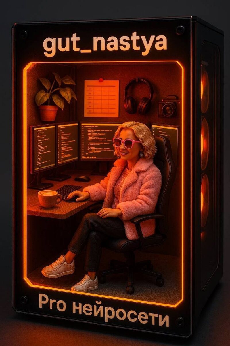 Как повторить? Шаг 1 - отправляем ваше фото в GPT чат https://chat.openai.com или Sora в бота. И пишем промт - Создай "Миниатюрную 3D-диораму с высокой детализацией внутри прозрачного корпуса для ПК высокого класса с белыми матовыми надписями "gut_nastya " вверху и "Pro нейросети" внизу. Яркая RGB-подсветка в красных и желтых тонах, а на столе - чашка латте с кофе . На заднем плане - расписание, настенное растение в горшке, наушники, ipad и камера На ней изображена женская фигура, одетая в розовую шубку с фото референса, черные брюки и белые кроссовки . Она сидит в офисном кресле перед тремя компьютерными мониторами Обязательно редактируйте под свой стиль, цвет, текст И отправляйте свои работы…