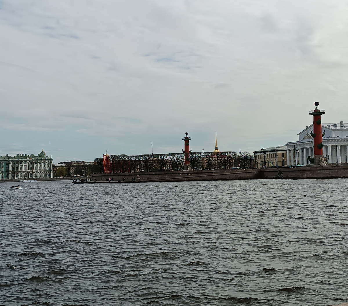 6 мая 2025 года Здравствуйте, друзья! 2 мая в Петербурге была отличная погода, тепло и солнечно. Иногда набегали лёгкие облачка, но они совершенно не портили общего впечатления. Ветер тоже не особо докучал, даже "над вольной Невой". Самое время совершить прогулку по городу, вспомнить его самые примечательные места. После музея "Фаберже" на Фонтанке и встречи с Аничковым мостом, у меня была встреча с Ириной "Карта И. по Питеру", мы с ней посетили небольшой магазин женской одежды "Рунто", о котором я ещё расскажу и расстались недалеко от Петропавловской крепости, откуда открывался вид на Неву, стрелку Васильевского острова и Зимний дворец. Вот отсюда и начался мой неспешный маршрут. По Биржевому мосту через Малую Неву попала на стрелку Васильевского острова. Ростральные колонны - это ещё одно место в Санкт-Петербурге, куда хочется возвращаться снова и снова. Они напоминают о мощи и величии Российского флота, если найдутся те, кто забыл. А скульптуры в основании колонн по словам архитек