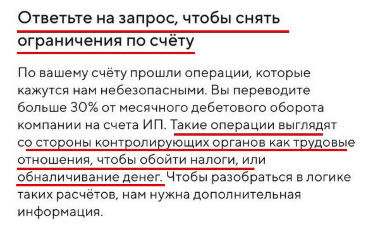 у ИП заблокирован расчётный счёт. Перевели 4,5 млн рублей, все деньги — заморожены. Подрядчикам платить нужно было ещё вчера. Бизнес — на грани кассового разрыва. 📌 Важно: у этого ИП это не первая блокировка, ранее уже были намёки от банка: «Нам не нравится, как вы выводите деньги».