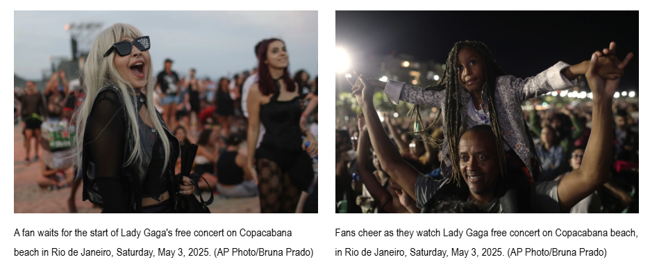 Певица Леди Гага дала бесплатный концерт на пляже Копакабана в бразильском городе Рио-де-Жанейро, его посетили более двух миллионов человек. Об этом сообщает Associated Press со ссылкой на информацию от организаторов мероприятия. Чтобы попасть на концерт, фанаты занимали очередь с раннего утра. Леди Гага исполнила свои хиты Alejandro, Poker Face и Abracadabra, во время выступления развернула на сцене бразильский флаг и заявила, что фанаты «творят историю» вместе с ней. Концерт прошел вечером 3 мая, расходы на его проведение, как сообщает Би-би-си, оплатили власти города. Организаторы концерта отчитались о визите в город 500 тысяч иностранных туристов и посетителей из других регионов Бразилии. Это число превысило первоначальный прогноз в два раза. Безопасность во время концерта обеспечивали 5 тысяч силовиков, которые использовали дроны и камеры для распознавания лиц. Администрация Рио-де-Жанейро ожидает, что концерт принесет городу около 100 миллионов долларов. Бесплатные концерты на пл