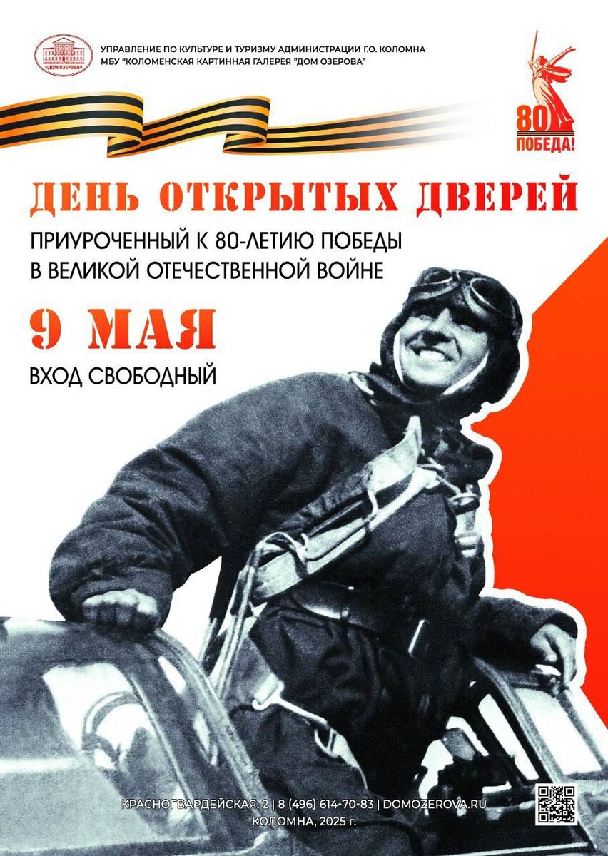 9 мая в Доме Озерова состоится день открытых дверей, приуроченный к 80-летию Победы в Великой Отечественной войне. 9 мая — день, когда мы вспоминаем тех, кто подарил нам мир. Экспонаты и картины помогут вам прочувствовать эпоху, увидеть войну глазами художников. В этот день для свободного посещения доступны экспозиции 1 и 2 корпуса музея: • музейно-выставочный зал М.Г. Абакумова; • выставочный проект "Наша Россия"; • выставка "Природа цвета" индийского художника Викранта Шитоле; • выставка "Весна, которую мы помним…"; • постоянная экспозиция "Прогулка по Коломне"; • постоянная экспозиция "Здесь русский дух"; • выставка "Весна Победы"; • фотовыставка "Незаметное присутствие". Выставочные залы доступны с 10:00 до 18:00.