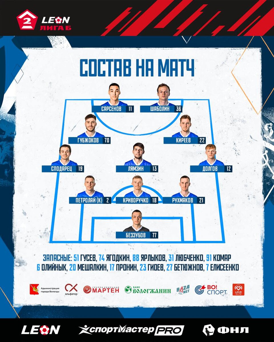 Состав бело-голубых на дерби! 👊🏻 Вперёд, «Динамо»! 💙 @dynamovologda