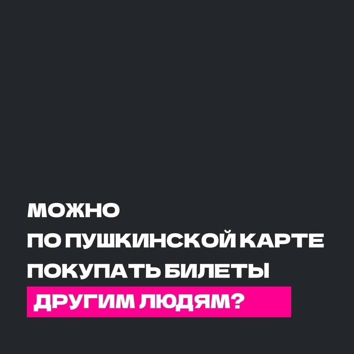 #Пушкинскаякарта ❓Можно по Пушкинской карте покупать билеты другим людям? Нет. Посещать мероприятие по билету, оплаченному Пушкинской картой, может только её держатель. 🎫 Билет является именным. Для входа на мероприятие понадобится паспорт и установленное мобильное приложение «Госуслуги. Культура». Если данные на билете, в паспорте и профиле мобильного приложения не совпадут, пройти на мероприятие не получится. Нельзя дарить свой билет, перепродавать, приобретать билеты для друзей и родственников. ❌В случае передачи билета другому лицу, гражданин будет исключен из программы.