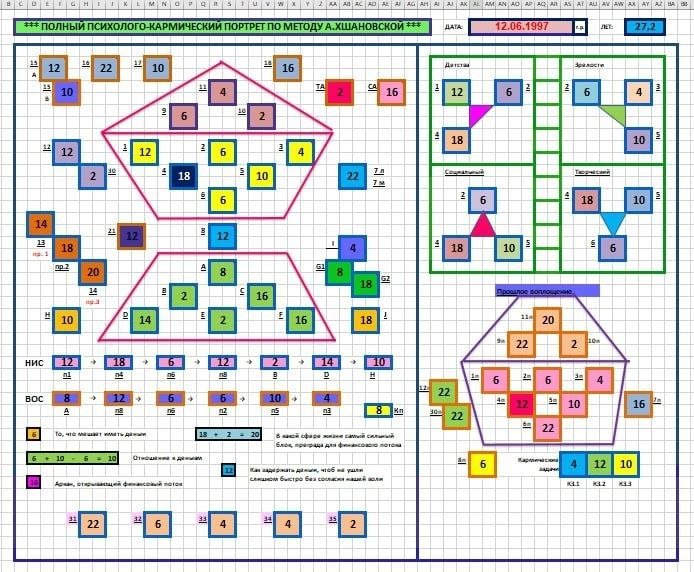 Калькулятор от Л. Стукаловой Полный психологический портрет — это комплексная характеристика человека, включающая в себя описание его внутреннего мира, особенностей характера, темперамента, интеллекта, способностей, мотивации и разных других качеств и реакций. Я для себя и для вас сделала калькулятор «Полный психологический портрет» с расшифровками, с дополнительными вкладками, которых нет ни у кого. Я постоянно его дополняю, чтобы он мог вам помочь увидеть некоторые моменты про человека и рассказать ему еще больше уникальности и глубины. И вот сейчас я дополнила калькулятор КВАДРАТАМИ из Геометрии Портрета. Есть еще треугольники, пассажи, ромбы, песочные часы и дуплеты. Они будут попозже сделаны. А сейчас про квадраты. Квадраты — это уникальные фигуры в структуре Портрета. Они помогают понять, как человек проявляет себя в профессиональной и личной жизни, какие возможности он видит перед собой и какие препятствия может встретить. Сфера материальной реализации человека состоит из пяти к