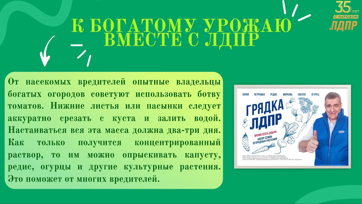 Мечтаете о богатом урожае? Тогда оставайтесь с ЛДПР! Опытные владельцы роскошных грядок знают множество интересных секретов и тонкостей, которые помогают им из года в год собирать щедрый урожай. Хотите узнать эти секреты? Специально для вас, Тюменское региональное отделение ЛДПР запускает рубрику «К богатому урожаю вместе с ЛДПР». Мы будем делиться полезными советами и проверенными методами, которые помогут вам вырастить здоровые растения и получить отличный урожай. Не упустите возможность узнать секреты богатого урожая от ЛДПР! Следите за нашими публикациями и готовьтесь к новому дачному сезону вместе с нами! Напоминаем, что если вы хотите получить качественные семена «Грядка ЛДПР», то вы можете обратиться в местное отделение ЛДПР вашего муниципалитета, в Тюменское региональное отделение ЛДПР или заполнить заявку онлайн по ссылке: vk.com/app53455430