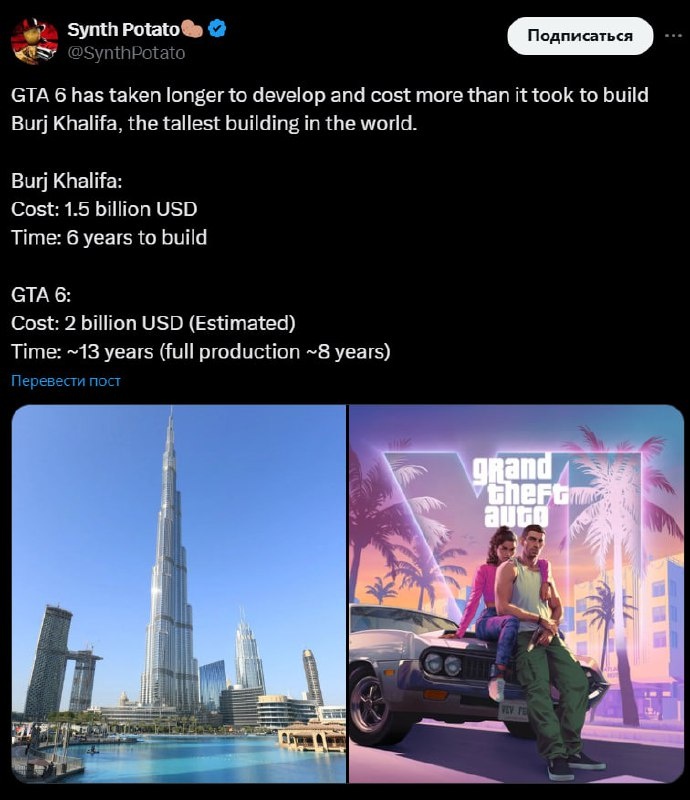 В ответ на пост Выпуск GTA VI уже занял больше времени и обошёлся предположительно дороже, чем строительство Бурдж-Халифа, самого высокого здания мира. • Небоскрёб в Дубае строили 6 лет и потратили $1,5 млрд • GTA VI – не менее 8 лет и около $2 млрд