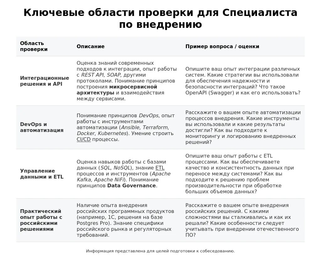 - Навыки коммуникации:Оценивается умение четко и понятно объяснять сложные технические концепции клиентам и коллегам. Важно уметь выстраивать доверительные отношения и находить общий язык с разными типами людей. Могут попросить рассказать о сложном проекте внедрения, где приходилось много общаться с заказчиком, и как вы справлялись с разногласиями.