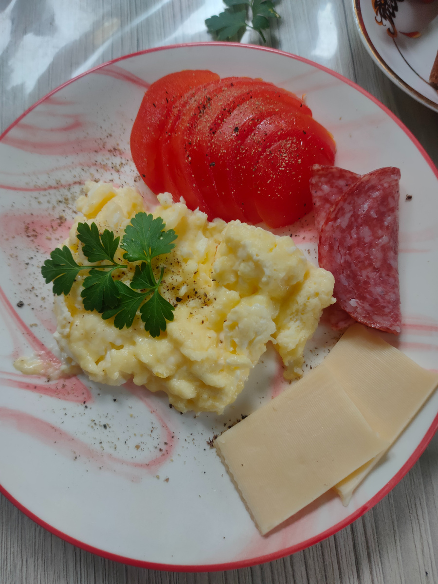Завтрак: скрембл, в который я добавила сметану, с ней он вкуснее,