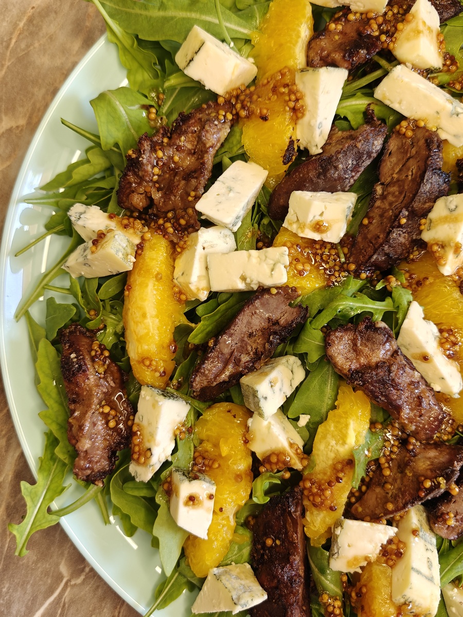 Ингредиенты: Апельсин 1 шт. Сливочное масло 20 гр. Сахар 1 ч.л. Куриная печень 250 гр. Кукурузный крахмал 1 ст.л. Растительное масло 40 мл. Руккола 100 гр. Голубой сыр 130 гр. Для заправки: Горчица в зёрнах 2 ч.л. Растительное масло 2 ст.л. Соевый соус 1 ст.л Сушёный чеснок 1/2 ч.л. Соль щепотка Приготовление: Апельсин очистите от кожуры и плёнок. Обжарьте дольки на сливочном масле с чайной ложкой сахара — по 1 минуте с каждой стороны. Куриную печень разрежьте пополам, обваляйте в крахмале и обжарьте на растительном масле по 5 минут с каждой стороны. При желании нарежьте печень на более мелкие кусочки. Смешайте все ингредиенты для заправки. На большом блюде выложите подушку из рукколы. Сверху — дольки апельсина, затем горячие кусочки печени. Добавьте голубой сыр и полейте соусом. Подавайте сразу! Готовьте, экспериментируйте, не бойтесь!