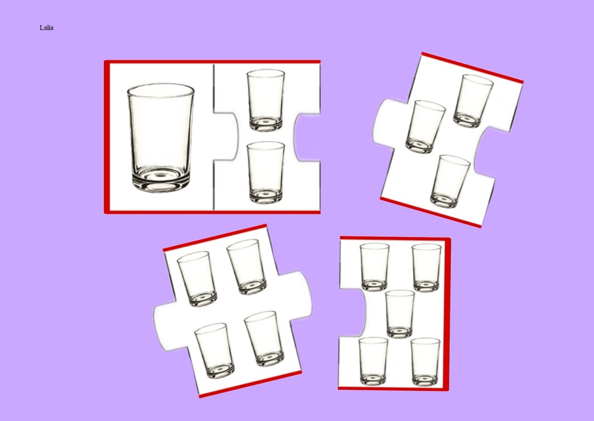 Правила игры: необходимо собрать пазл, считая предметы (например: один стакан, два стакана, три стакана, четыре стакана, пять стаканов)