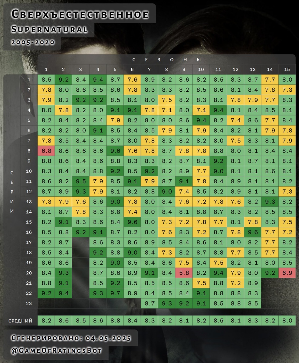 «Сверхъестественное» (Supernatural) — американский телесериал, выходивший с 2005 по 2020 год. Он рассказывает о приключениях братьев Винчестеров, Сэма и Дина, которые охотятся на сверхъестественных существ. За 15 сезонов шоу завоевало большую аудиторию и запомнилось множеством необычных и креативных эпизодов. Генератор таблиц с рейтингами ваших любимых сериалов Особенный эпизод: «Ошибка по-французски» (сезон 6, серия 15)