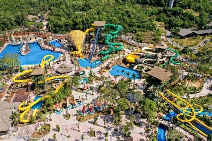 Эти парки развлечений во Вьетнаме называются Винперл (Vinpearl). Я ровно в таком же, только на острове Фукуок, тоже лишился девственности с помощью двенадцатилетних вьетнамских девочек. В смысле первый раз в жизни "слился в унитаз". Это по терминологии любителей аквапарков так называются огромные воронки. См. на фото - большая желтая, вот через нее я ехал. Взобрались мы с приятелем на самый верх (а это высоко, по фото не скажешь, но там ого), а наверху стоит стенд с правилами и весы, как в советских овощных магазинах, железная платформа такая. И в правилах написано, что съезжать можно вчетвером, но суммарный вес не более 290кг, или вдвоем, но тогда разница в весе не более 20кг. Приятель весит 125, я 103, то есть вдвоем нам нельзя. А если вчетвером - то на еще двоих остается 62 кг, это где же таких найти. И вот стоим мы грустно на самом верху и понимаем что нам путь-дорога вниз по лестнице, как вдруг наверх забираются две вьетнамские девочки лет 12-ти. И распорядитель аттракциона говори
