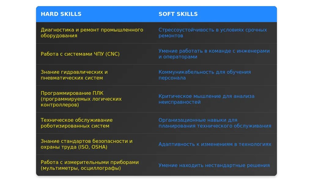 - Баланс: Сочетайте узкоспециализированные навыки с общими, например: "Ремонт сложного оборудования + управление проектами."