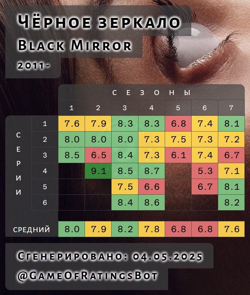 @GameOfRatingsBot «Чёрное зеркало» (Black Mirror) — это британский сериал-антология, в котором каждая серия представляет собой самостоятельную историю, исследующую тёмные стороны взаимодействия человека и технологий. Сериал затрагивает темы цифровой зависимости, искусственного интеллекта, приватности и моральных дилемм в высокотехнологичном мире. Особенно запомнился эпизод «Белое Рождество» (White Christmas). Это мрачная и многослойная история, состоящая из трёх взаимосвязанных рассказов, в которых исследуются темы цифрового сознания, изоляции и наказания. В эпизоде фигурируют технологии, позволяющие «блокировать» человека в реальной жизни, а также переносить сознание в виртуальные миры. Благодаря своей напряжённой атмосфере и глубоким этическим дилеммам, «Белое Рождество» считается одним из лучших и самых обсуждаемых выпусков сериала. Эпизод «Белое Рождество» (White Christmas) — это специальный рождественский выпуск, вышедший между 2 и 3 сезонами сериала «Чёрное зеркало» (Black Mirror