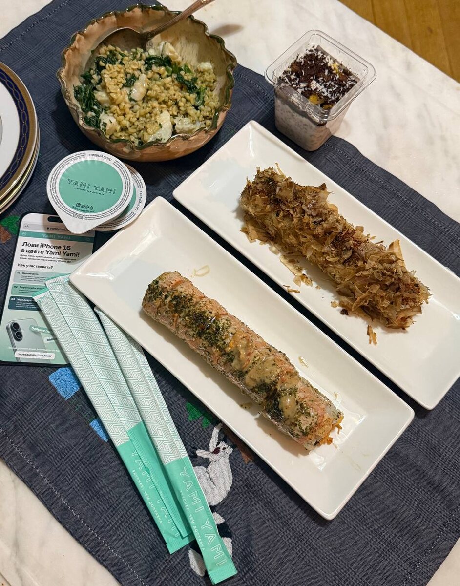 #ачтонаужин Самый частый вопрос, который я задаю сыну 🤣 На праздниках «лежуньканьем» занималась не только я. Обычно у нас дома ужины готовит сын, благодаря которому я питаюсь как в лучших ресторанах. А тут поняла, что ему тоже надо отдыхать плюс как раз прилетела новость про обновление меню в Yami Yami. И самые отсталые слои населения (я о себе) сдались, мы заказали доставку. Я как блондинка повелась на цвет (люблю все оттенки Тиффани). Что-то мне подсказывает, что теперь мы будем делать это чаще и соответствовать тренду. Отзыв про новое меню попросила написать Тиграну, он это делает лучше меня. Я могу отметить только одно — вкусно. «На конец 2024 года объем рынка доставки готовой еды составил 648,7 млрд рублей. Обычно не утруждаю курьеров и готовлю либо сам, либо дохожу до ресторанов. Но к роллам всех приучили, что если это именно роллы, а не оригинальные японские суши, то их надо заказывать себе домой. Заказываешь, ждешь, надеешься, что не перевернут и привезут как на картинке.