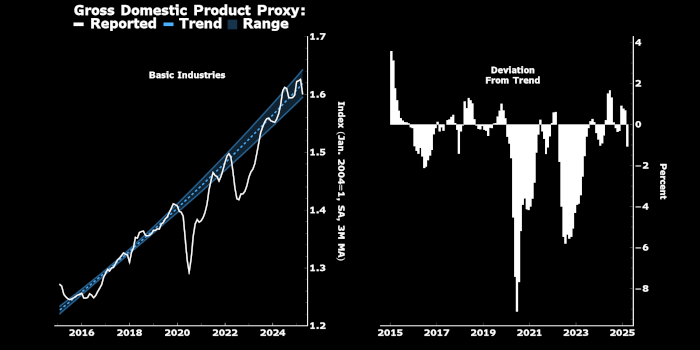 В I кв. ВВП РФ снизился на 1,3% кв/кв с поправкой на сезонность, и в ближайшие месяцы Банку России придется балансировать между рисками для экономического роста и инфляции, чтобы не довести страну до рецессии, пишет экономист Bloomberg Economics Александр Исаков. Слева: официальная статистка по ВВП РФ (с поправкой на сезонность, показатель на уровне 1 соответствует январю 2004 года), справа: отклонение от тренда в %. Источник: Bloomberg Процентные ставки в России резко выросли в 2024 году на фоне попыток ЦБ сдержать инфляцию и охладить перегретую экономику. Свежие данные за первый квартал этого года показывают, что ДКП работает: экономическая активность сократилась, а инфляция замедлилась. Но, возможно, ДКП работает слишком хорошо. В ближайшие месяцы центральному банку придется балансировать между рисками для экономического роста и инфляции, чтобы не довести экономику до рецессии. Рост ВВП РФ в этом году почти наверняка не достигнет прогнозируемых правительством 2,5%, но регулятор все