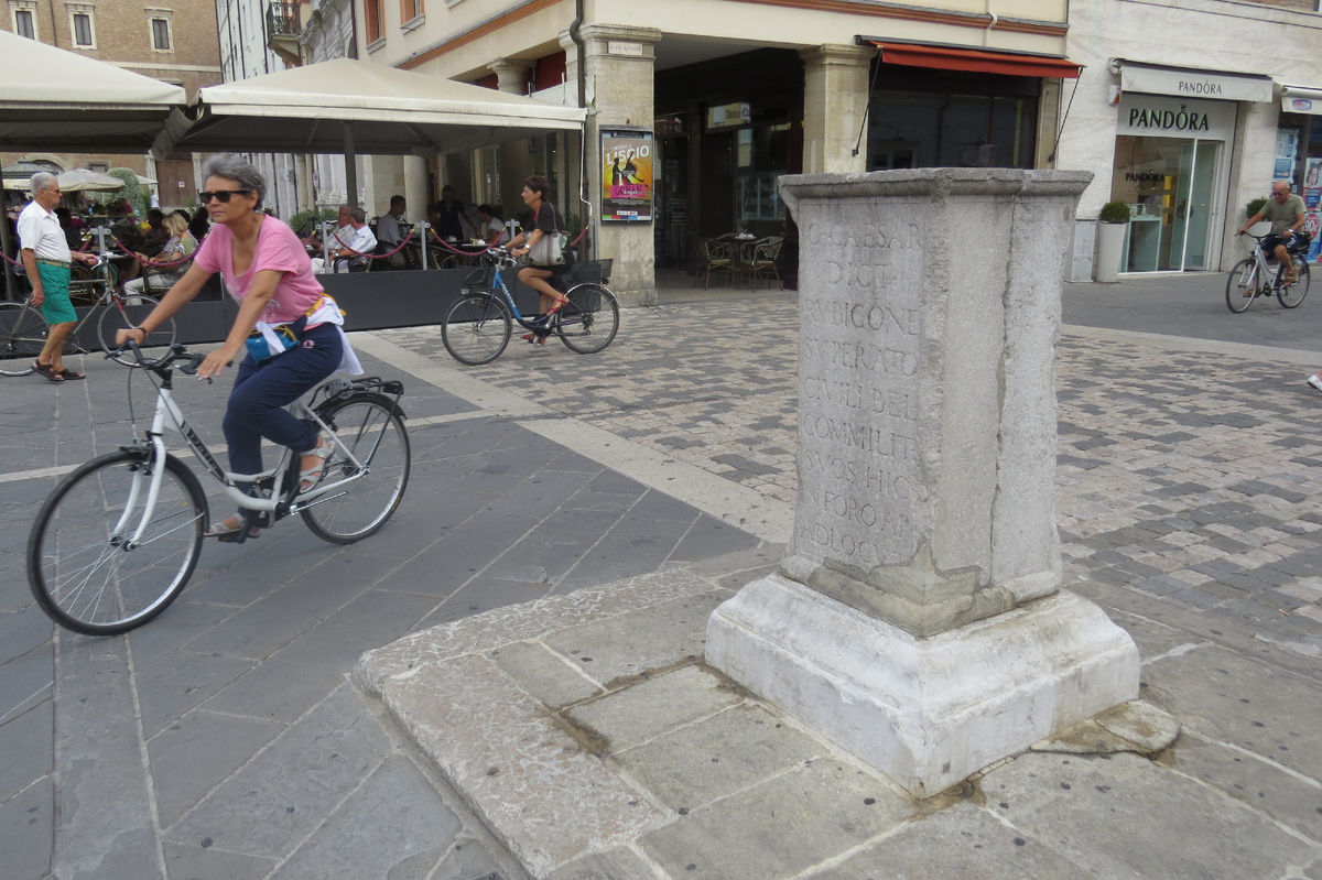 Если вы хотите совершить в своей жизни что-то невероятное, но у вас не хватает мужества, съездите в итальянский город Римини. Он знаменит тем, что здесь более двух тысяч лет назад Юлий Цезарь совершил ради обретения власти решительный поступок — перешел реку Рубикон. Произошло это в 49 году до нашей эры. Вопреки запрету римского сената, знаменитый полководец со своими легионами перешел реку, воскликнув: «Жребий брошен!» (по договоренности с сенатом, он должен был распустить войска до входа в Рим). Это послужило началом войны между сенатом и Юлием Цезарем, в результате которой последний овладел Римом. Площадь Кавур, на которой установлен памятник Папе Римскому Петру V (фото ниже). Рядом с площадью — рыбный рынок, работающий еще с XVIII века. Много с того времени воды утекло. Вся утекла! Река сейчас — не река, а… центральная улица города Римини, на которой установлен памятник Юлию, и недалеко — географическая метка о том, что в этом месте когда-то текла река Рубикон, где Цезарь сделал