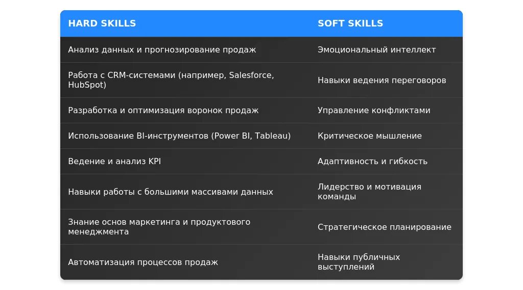 - Обязательные навыки: Управление CRM (Salesforce, HubSpot), аналитика продаж, работа с KPI, проведение переговоров, стратегическое планирование.