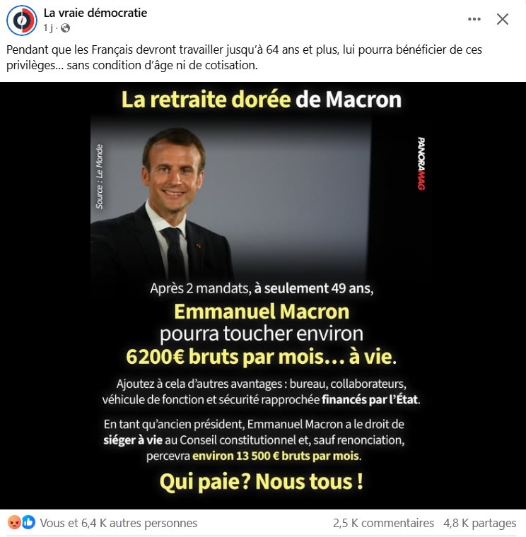 Хочу поделиться с вами свежей публикацией во франкоязычном сегменте популярной соцсети. " В то время, как французы должны работать до 64 лет и более, он сможет воспользоваться этими привилегиями... без каких-либо условий по возрасту и трудовому стажу. После двух сроков на посту президента, в возрасте всего лишь 49 лет, Эммануэль Макрон сможет получать 6200 евро в месяц... всю оставшуюся жизнь. Добавьте к этому другие привилегии : офис, сотрудники, служебный транспорт и охрана за государственный счет. В качестве бывшего президента Макрон имеет право заседать пожизненного в Конституционном Совете и , если только сам не откажется, будет получать примерно 13500 евро в месяц. Кто платит? Мы все!" Порадовали комментарии французов по поводу этой публикации: "А в тюрьму когда?" "Надеюсь, что он не проживет так долго, как Жискар д’Эстен". " Это ерунда по сравнению с сотнями миллиардов, которые утекают в ЕС и зеленскому. Мы их больше никогда не увидим". "Позор, учитывая его достижения". " Есл