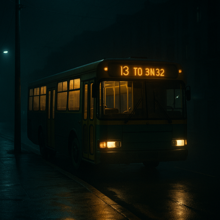 Я сел в автобус №13 поздним вечером, после смены. В маршрут он не входил, но табло почему-то светилось ярко, и водитель жестом позвал меня внутрь. Я пожал плечами — до дома всё равно было далеко, а ноги гудели. Внутри — полумрак. Лишь дежурный свет на потолке и тусклые фонари снаружи. Пассажиры были… странными. Первая — пожилая дама в вечернем платье и перчатках, будто вышла с бала. Сидела прямо, смотрела в окно, хотя там была только темнота. Второй — мужчина в клетчатом костюме, с портфелем на коленях. Он держал его обеими руками, как будто внутри что-то важное. На мои взгляды не реагировал. Третий — подросток с раскрашенным лицом, как у клоуна. Смотрел прямо на меня и улыбался. Широко, чересчур дружелюбно. Сел ближе к выходу. Когда автобус поехал, я заметил, что он не останавливается — проезжаем мимо обычных остановок, будто их не существует. — Вы... здесь живёте? — спросил я у дамы. — Временно, — ответила она, не поворачиваясь. Портфельный мужчина перебил: — Мы все едем ту