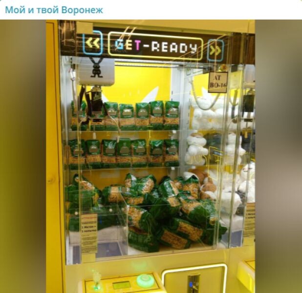 Горожане с юмором отнеслись к новшеству Призовой автомат, где можно выиграть только макароны, заметили в воронежском ТРЦ «Град». Кадры появились в социальных сетях. Горожане под постом в социальных сетях пошутили, что более дорогие призы в автомат класть уже невыгодно из-за растущих цен. Также местные жители утверждают, что рядом стоит автомат, где можно выиграть лапшу быстрого приготовления. Стоит отметить, что рядом с необычным автоматом стоит вполне традиционный — с мягкими игрушками. Какой из них пользуется популярностью у горожан больше, неизвестно. Ранее мы писали, что мужчина украл автомат с конфетами в воронежском микрорайоне.