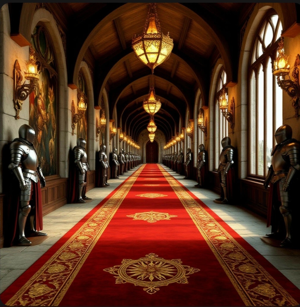 Теперь освобождённый от лишних мыслей я довольный рассекал коридоры академии. Всё было как в сказке. Стойки с рыцарской бронёй, что словно часовые ожидали приказ об обороне храма знаний. На стенах висели красивые картины, которые будто могут ожить если на них долго смотреть. Но красота была не только по сторонам, но даже над головой и под ногами. Если говорить про первое, то там были канделябры с горящими свечами, что играли различными цветами. Свет от огня интересно играл с металлом и стеклянными элементами ламп. Шли же мы по красивым красным коврам по краям у которых был золотистый ворс.