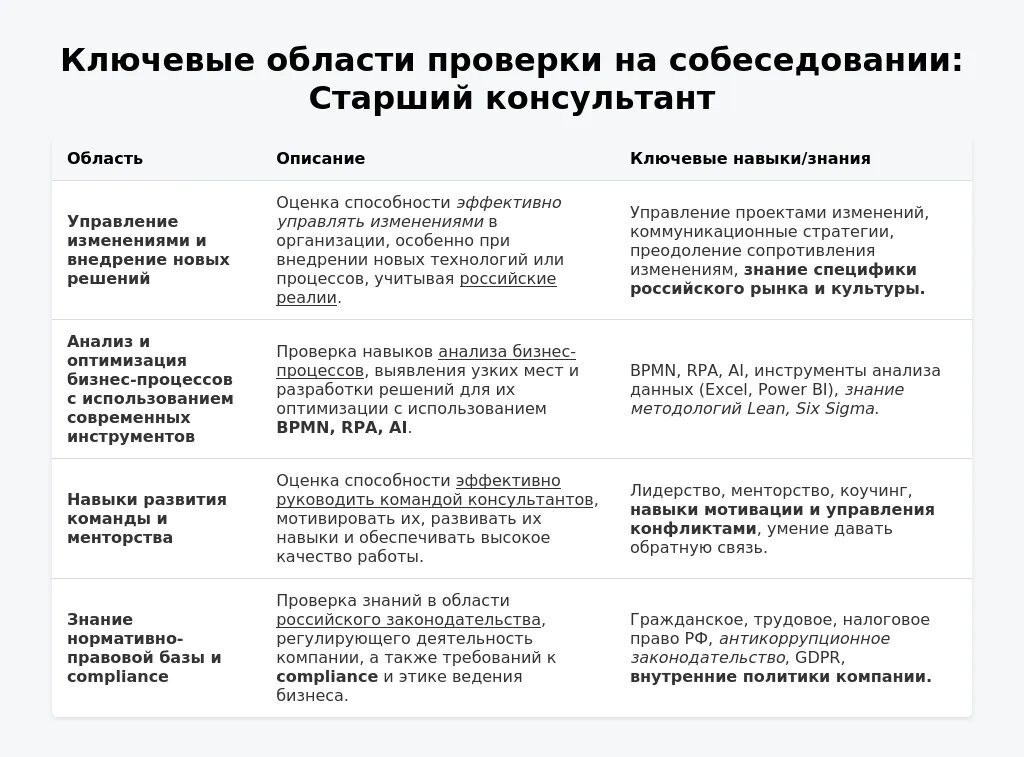 - Завышенные зарплатные ожидания (в Москве для старшего консультанта в 2025 году это обычно свыше 300 000 рублей, но зависит от отрасли).