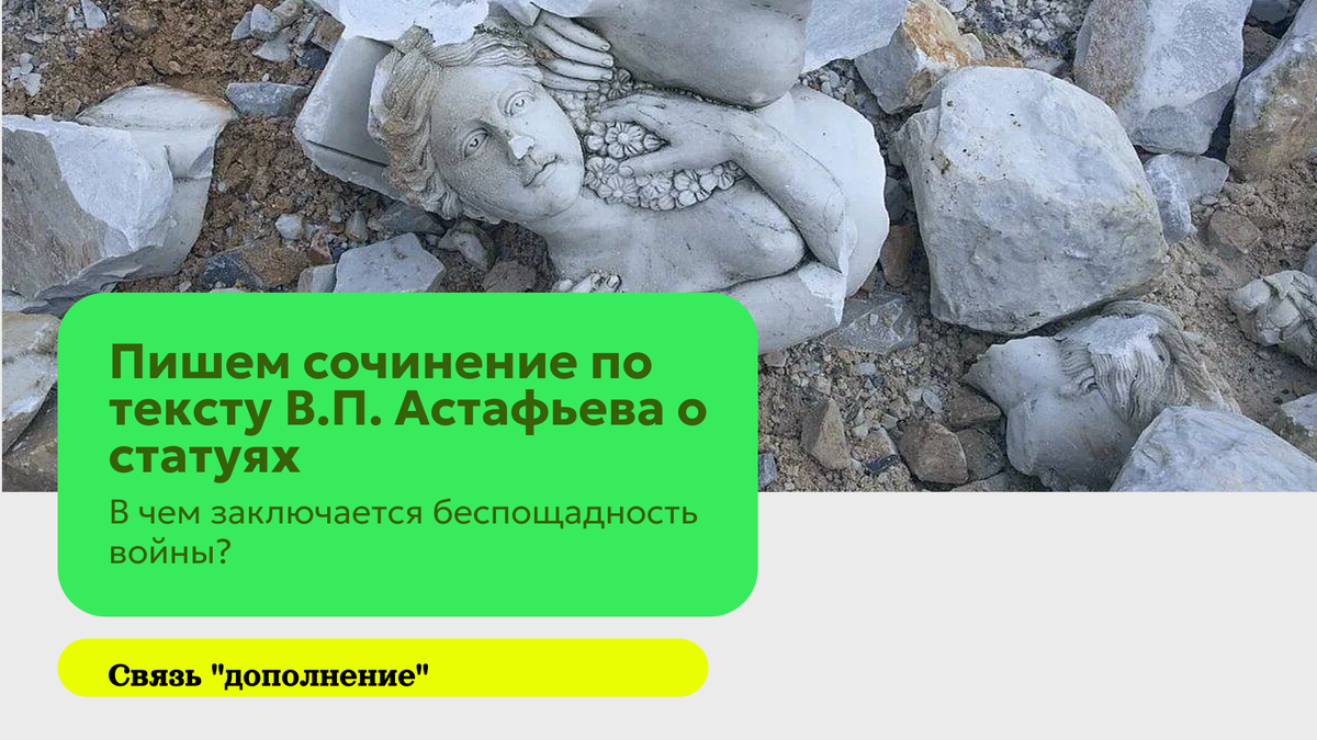 Сегодня проанализируем текст Астафьева В.П. о статуях. Текст взят из досрочного экзамена 2025 года. При разных подходах к тексту можно увидеть несколько типов связи между примерами: "противопоставление", "аналогия". Но мне все же более удачной здесь видится связь "дополнение". Чтобы привести пример из жизненного опыта, предлагаю вспомнить, как важно было во время войны сохранить культурные ценности, как люди, жертвуя собой, восстанавливали разрушенные дворцы и храмы. Нельзя не согласиться с точкой зрения писателя. Действительно, война уничтожает главные ценности: жизнь человека и творения его рук. Искусство содержит в себе память о человеке-творце. Война беспощадно пытается уничтожить ее. Вспомним, как во время войны подвергся разрушению Петергоф. Уничтожено было все: дворцы, статуи, фонтаны… Низкий поклон тем, кто смог восстановить этот уникальный комплекс. Они вернули нам Память, Историю, Красоту Хотите получить готовое сочинение по тексту? Готовые сочинения и очень много по