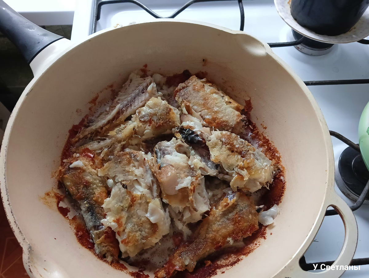 Всё, с меня хватит! Ну не могу я уже сладить с этой сковородкой. Всё на ней пригорает, липнет так что и ножом не отдерёшь. Захотелось мне опять сегодня рыбки пожарить, купила минтай, вчера его в продаже не было, сегодня появился. Можно было бы подумать, что его несколько раз размораживали, но нет, его только привезли.Почему он так прилипает к сковородке? Я его(минтай) разделала, помыла, высушила салфетками и в дуршлаг положила. И только потом начала жарить. Процесс жарки меня вымучил. Очень жаль расставаться с этой удобной по размеру сковородкой, но придётся. Потому что и картошку я жарила недавно, она тоже пригорела, макарошки по-флотски пригорели. И только один кусочек остался целым. Ну да, рыбка получилась вкусная, прожаристая, но изорванная вся на мелкие кусочки, ну это куда ни шло. Хоть этот кусочек запечатлить, что бы, как говорится, не зря мучилась. 😄 Румяный, с хрустящей корочкой. Но что-то не хватает. Напомню, что рыбу я ем без гарнира. А не хватает подливки, которую я тож