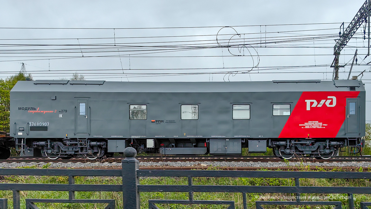 Недавно, проезжая мимо железной дороги, обратил внимание на необычный серый вагон на три с половиной окна. Раньше таких ни разу не видел. Выяснил подробности и готов рассказать об этом вагоне подробнее. Начнем с того, что вагон этот стоит на месте ремонта железнодорожных путей рядом с платформой, на которой установлен контейнер. Впереди находится желтый локомотив. Это не просто тепловоз, это путевая рельсосварочная машина ПРСМ-4. То есть, машина сваривает рельсы, на платформе могут быть сами рельсы или оборудование, а серый вагон, по логике, предназначен для рабочих. Так и есть. На вагоне надпись «Модуль сопровождения-2». Давайте посмотрим, что внутри. Этот вагон — настоящее общежитие на колесах. Модуль технического сопровождения и обслуживания предназначен для сопровождения специального подвижного состава, проезда и проживания персонала, сопровождающих груз или вагоны или обслуживающих объекты. В вагоне есть пять купе, санузел, две душевые кабины и много чего еще. Давайте посмотр
