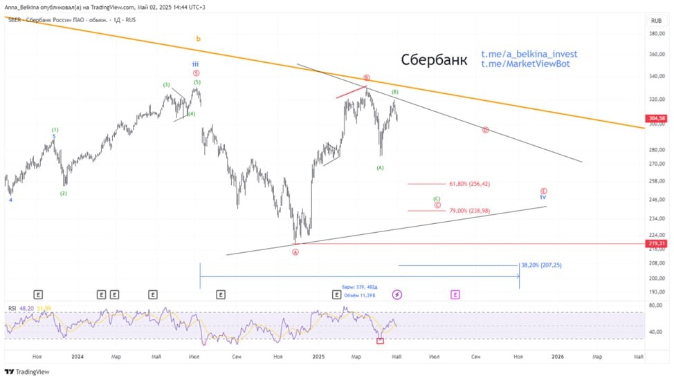 #SBER #банки Сбербанк После отката в волне (b) of [c] of iv треугольника движение по бумаге перешло к падению. Это соответствует волне (с) of [c] of iv - целевой диапазон для снижения на графике. Дневной RSI снял перепроданность, поэтому есть пространство для продолжения снижения. Не является ИИР
