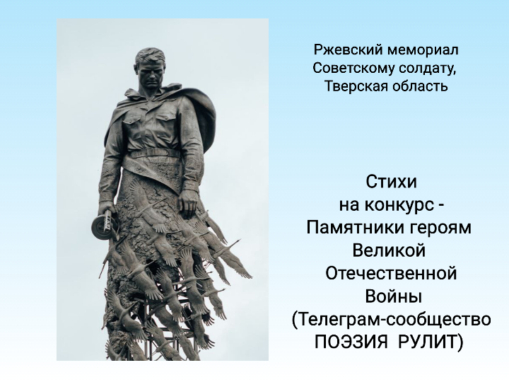 Я убит подо Ржевом, Я пропал в тех местах А сейчас ближе к небу, Журавлями в слезах. Я стою, вспоминая, Тех героев-солдат. Журавлиная стая, Под печальный набат. Бронзой залито тело, Гимнастëрка в пыли, Что со мною ты сделал, Свет печали в дали. Я сейчас подо Ржевом, Память верно храню. Всё, что смог, я и сделал, Подо Ржевом в бою. Этот Памятник Славы, Тем героям войны, Ржевской битвы, те главы, Унесли журавли. Я убит подо Ржевом, Я пропал в тех местах, Журавлями я к небу, Ждёт под Ржевом солдат. ~ Автор: Наташа Счастливая ~ Фото: Ржевский мемориал Советскому солдату, Тверская область ~ Стихотворение опубликовано в рамках поэтического конкурса "Памятники героям ВОВ" в Телеграм - Поэзия рулит, ссылка в коммент. #ПР_конкурс #стихи #поэты #поэзия_рулит