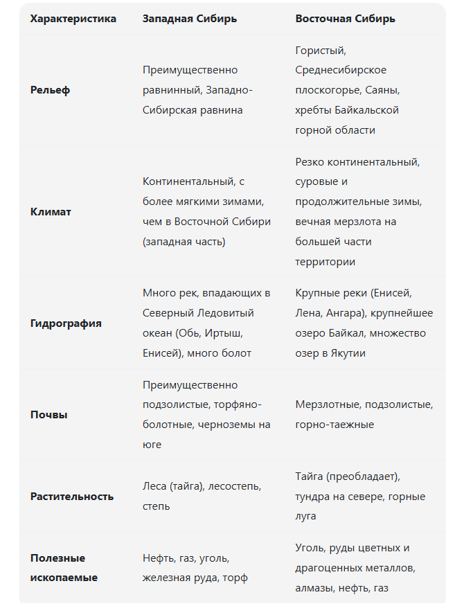 Сравнение Западной и Восточной Сибири — это сложная задача, так как обе территории огромны и очень разнообразны. Однако, можно выделить ключевые различия и сходства по различным аспектам: Географические характеристики: Население и экономика: Ключевые различия в краткой форме: Общие черты: Вывод: Западная и Восточная Сибирь - это два разных, но важных региона России. Западная Сибирь – это регион с развитой промышленностью, сельским хозяйством и густым населением, а Восточная Сибирь – это кладезь полезных ископаемых с уникальной природой и меньшей плотностью населения. Различия в географическом положении, климате и природных ресурсах обусловили различия в структуре экономики и образе жизни населения.
