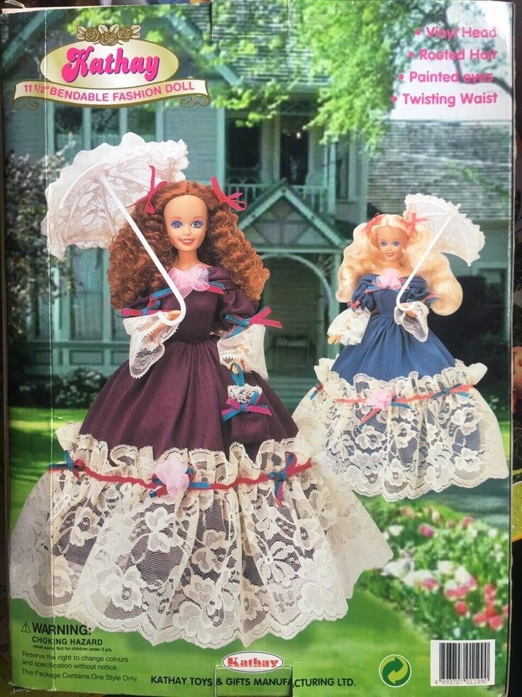 В одну из тех новогодних ночей, когда я ещё верила в дедушку Мороза, пытаясь его подкараулить у елочки в тот момент, когда он принесёт подарки, я и встретила её. Я увидела сверкающие кукольные глаза, в которых отражался свет гирлянд, и подумала, что лучше подарка и быть не может! Помню, как долго рассматривала куклу, не открывая коробки, и как потом разговаривала с ней. «Я назову тебя Катериной», шептала я ей, потому что читала тогда отрывок про Козетту из романа Гюго. Я точно помню это, и забавно, что имя совпадало с тем, как назвал куклу производитель. Kathay, или Кэти, как назвают этих кукол, от Гонконгской фирмы Kathay Toys&Gifts Manufacturing ltd. Вот так выглядела новая Кэти; изначально у неё ещё был кружевной зонтик. Сохранилось родное платье Катерины: пышное, винного цвета со светлым кружевом и бантиками-ленточками. Но сейчас она предпочитает более современную одежду, и носит куртку, пояс и ботильоны аутфита Barbie Style Teresa Floral Dress Doll (от Mattel). У неё тело с ногам