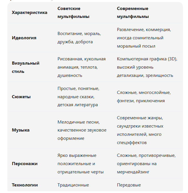 Сравнение советских и современных мультфильмов – это сравнение двух эпох, двух разных подходов к мультипликации, обусловленных разными идеологическими, экономическими и технологическими условиями. Советские мультфильмы: Современные мультфильмы: Сравнение в таблице: Плюсы и минусы: Вывод: Советские и современные мультфильмы – это продукты разных эпох с разными целями и задачами. Советские мультфильмы делали упор на воспитание и моральные ценности, в то время как современные мультфильмы больше ориентированы на развлечение и коммерческий успех. Каждый вид мультфильмов имеет свои преимущества и недостатки, и выбор зависит от личных предпочтений и целей просмотра. Важно помнить, что оба типа мультфильмов могут быть полезны для развития детей, если подходить к их просмотру осознанно.