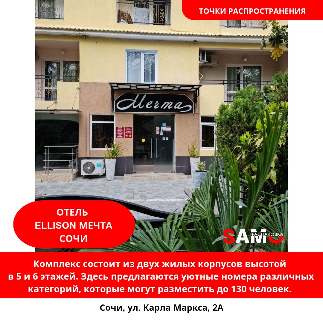 #точки_распространения_СамоРаспаковка_СОЧИ Друзья, представляем вам еще одну точку распространения нашего глянцевого журнала «SAMOРАСПАКОВКА» в городе Сочи. Отель Ellison Мечта Отель «Мечта» находится в самом центре курортного Адлера, на первой береговой линии. В непосредственной близости расположены несколько торговых центров, центральный рынок и разнообразные кафе и бары. Всего в 15 минутах езды находятся дельфинарий и океанариум, а также парк Южных культур. Удобные транспортные связи позволяют быстро добраться как до вокзала, так и до аэропорта – всего 20 минут в пути. Комплекс состоит из двух жилых корпусов высотой в 5 и 6 этажей. Здесь предлагаются уютные номера различных категорий, которые могут разместить до 130 человек. Каждый номер оборудован собственным санузлом, кондиционером и ЖК-телевизором. Некоторые номера имеют балконы, а также доступны апартаменты с кухней для самостоятельного приготовления пищи. На территории отеля функционирует небольшое кафе, где гости могут