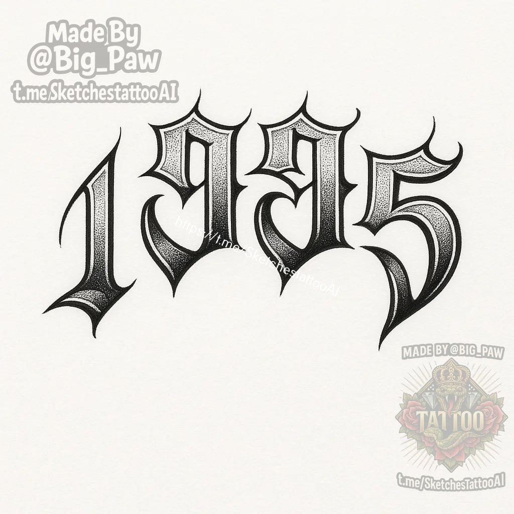 #2361 Подборка по запросу подписчика - мне нужен черно-белый эскиз с цифрами «1995» в готическом или мексиканском стиле шрифта. с изогнутой формой, так как она будет выше колена 🧠 SYNTX 💳 Донат 😎 НейроБро 😎 Эскизы без вотера 💀 Эскизы от нейросети #дата #1995 #шрифт #эскизы #тату #татуировки