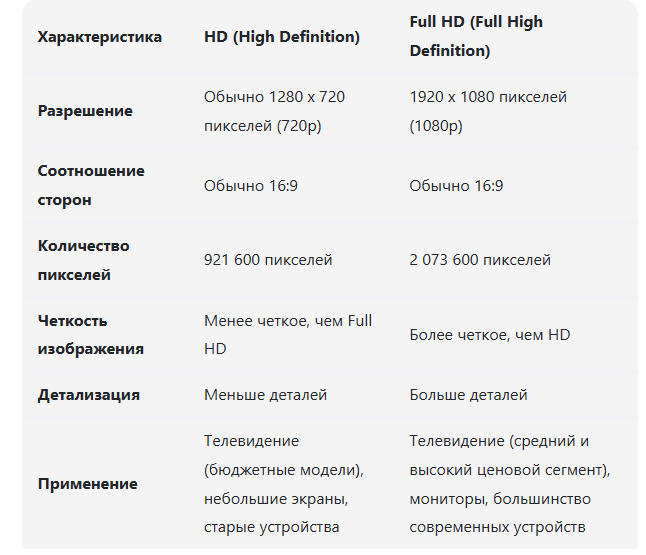 Сравнение HD (High Definition) и Full HD – это сравнение двух стандартов разрешения изображения, которые широко используются в телевизорах, мониторах, проекторах и других устройствах отображения. Основное различие между ними – количество пикселей, формирующих изображение. Чем больше пикселей, тем более детальным и четким будет изображение. Основные характеристики: Подробное сравнение: Преимущества и недостатки: HD (720p): Full HD (1080p): Вывод: Full HD значительно превосходит HD по качеству изображения. Если вы планируете покупать новый телевизор, монитор или проектор, то стоит отдать предпочтение моделям с разрешением Full HD или выше. HD может быть приемлемым вариантом только для очень небольших экранов или для устаревших устройств. В большинстве случаев разница в цене между HD и Full HD невелика, а выигрыш в качестве изображения существенный.